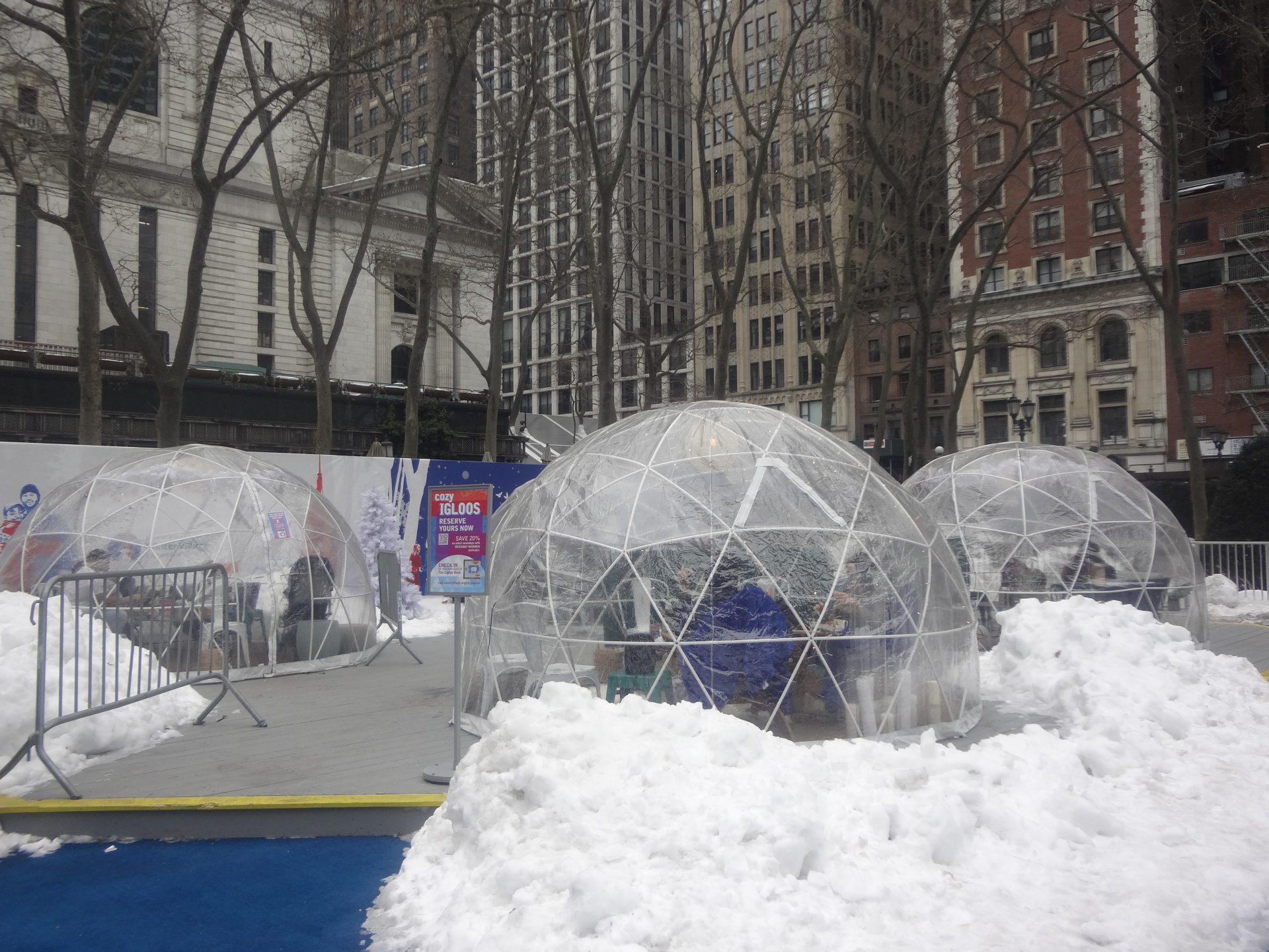 The whole Bryant Park Winter Village has a festive feel with shops and restaurants set up throughout the park. Igloos, clear heated domes with comfortable seating, are available for rent at the park.