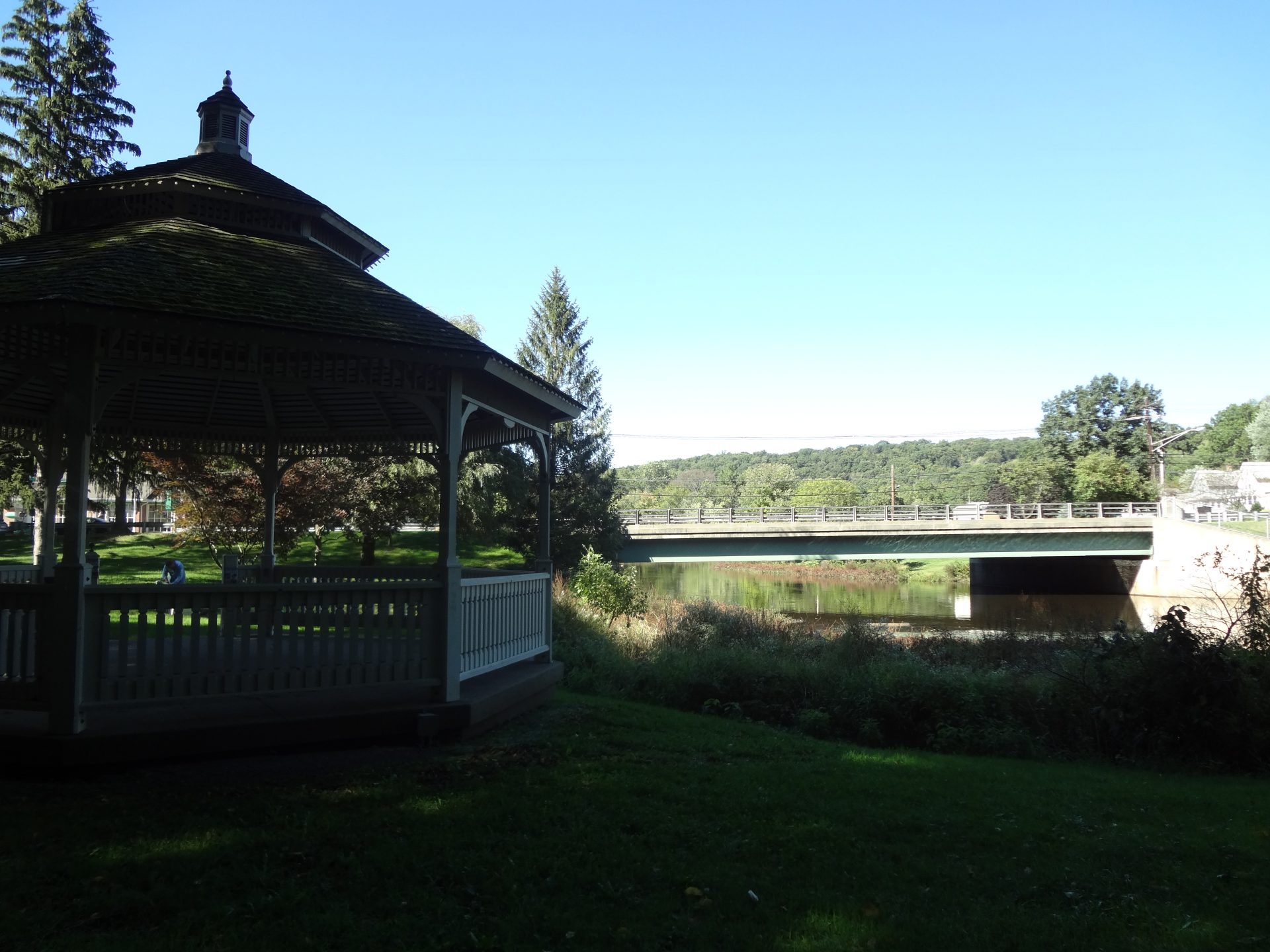 A bit farther down the path is a large gazebo and signs with the history of the park and how the body of water was used to create canals for commerce in the 1800s.