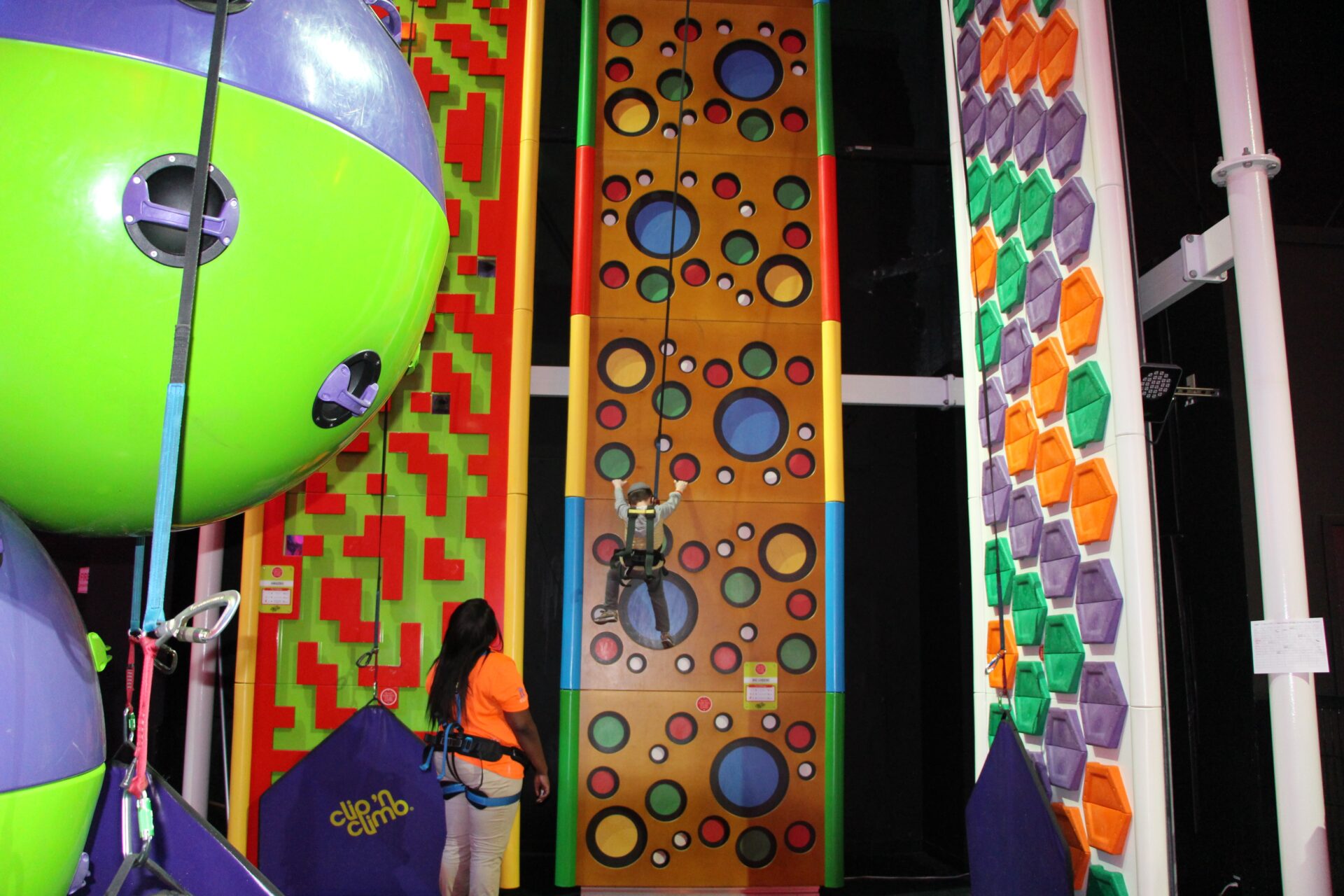 There are four climbing walls that are also appropriate for children under 48” tall. The Amazing Wall is a maze themed climbing wall, the Big Cheese Wall, has colorful holes for climbers to climb up, the Hexed wall is honeycomb-shaped wall great for beginners. Astroball, the most difficult, is balls stacked on top of one another and climbers try to get to the top.