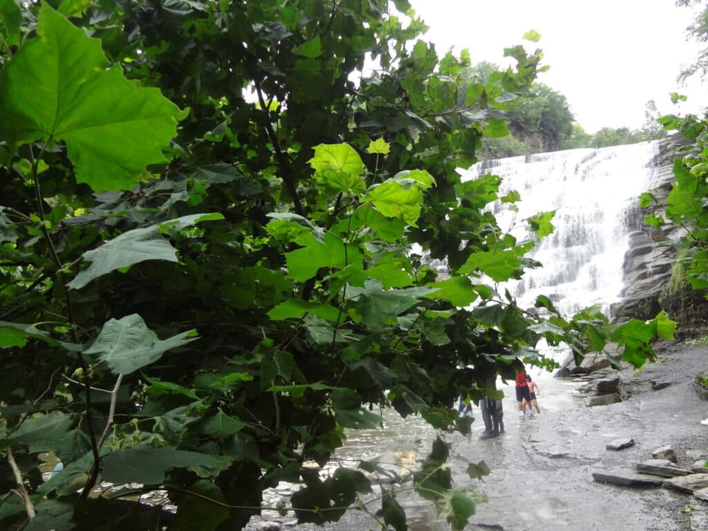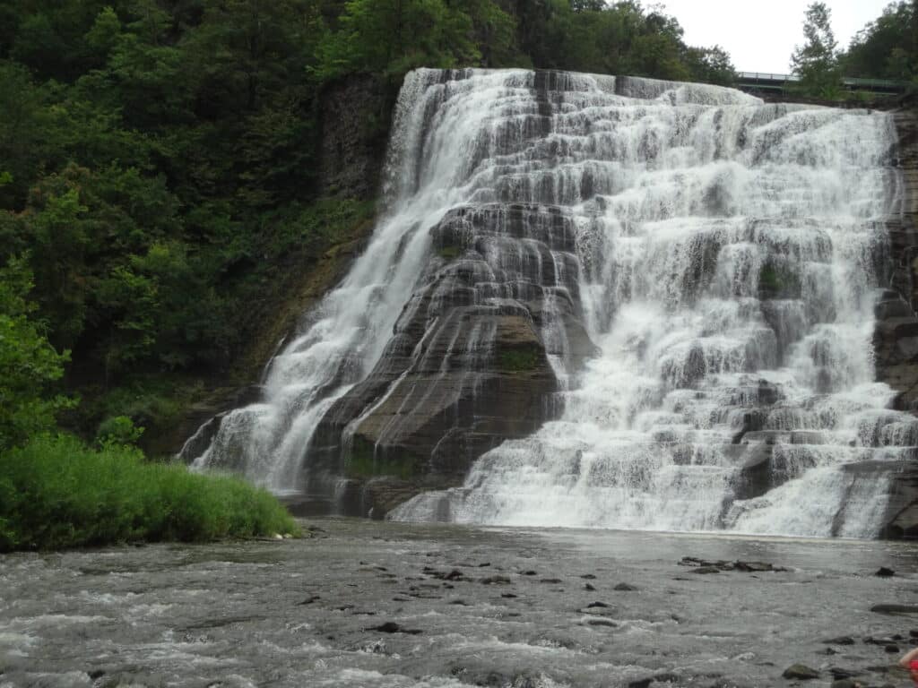 The town of Ithaca, in the Finger Lakes Region is blessed with many magnificent waterfalls right within the town. The imposing Ithaca Falls is a 150 foot tall and 175 foot wide lush waterfall and can be seen from the street. After parking in the adjacent lot, it is just a short walk on an unpaved flat path alongside the flowing water.