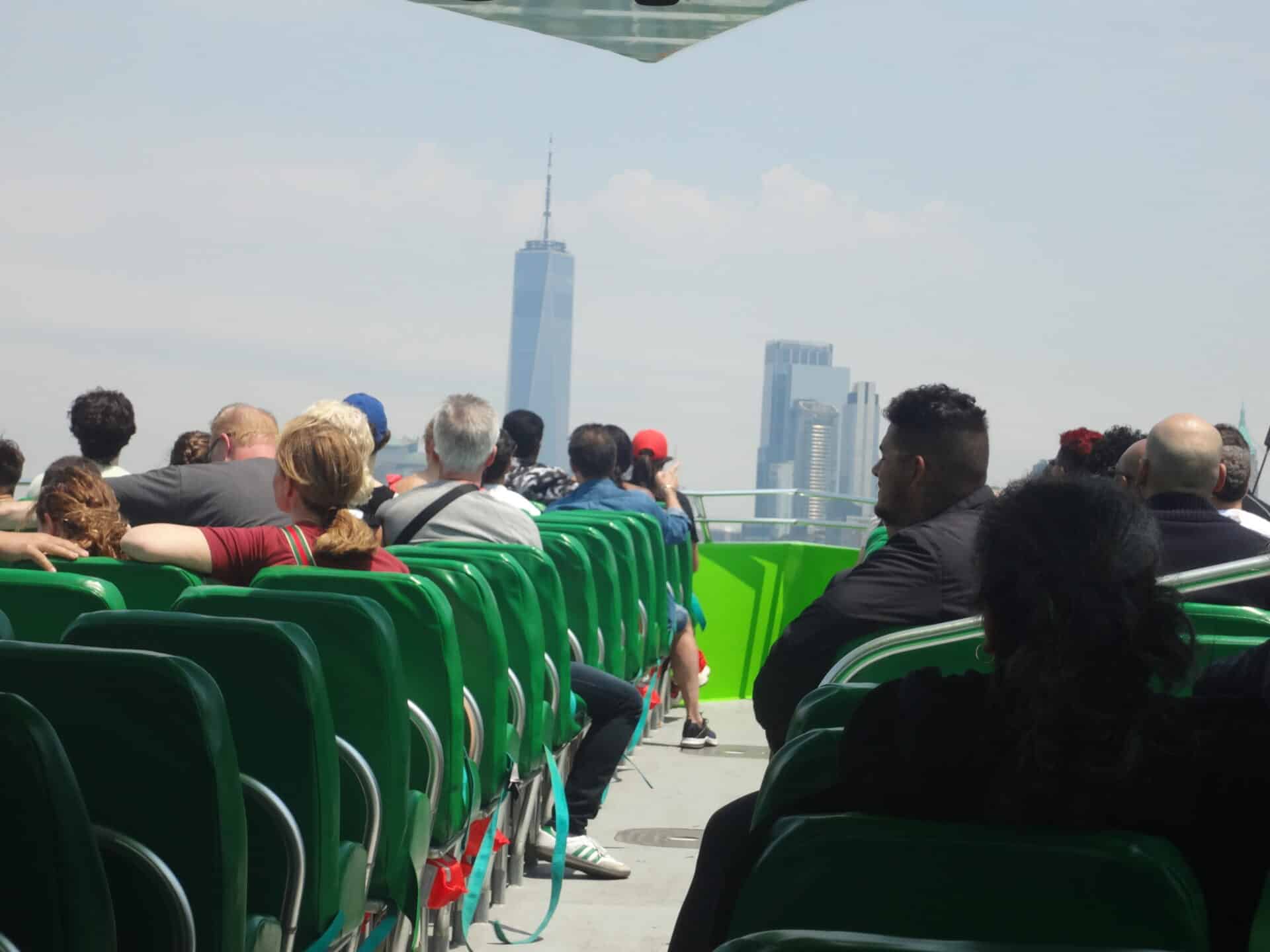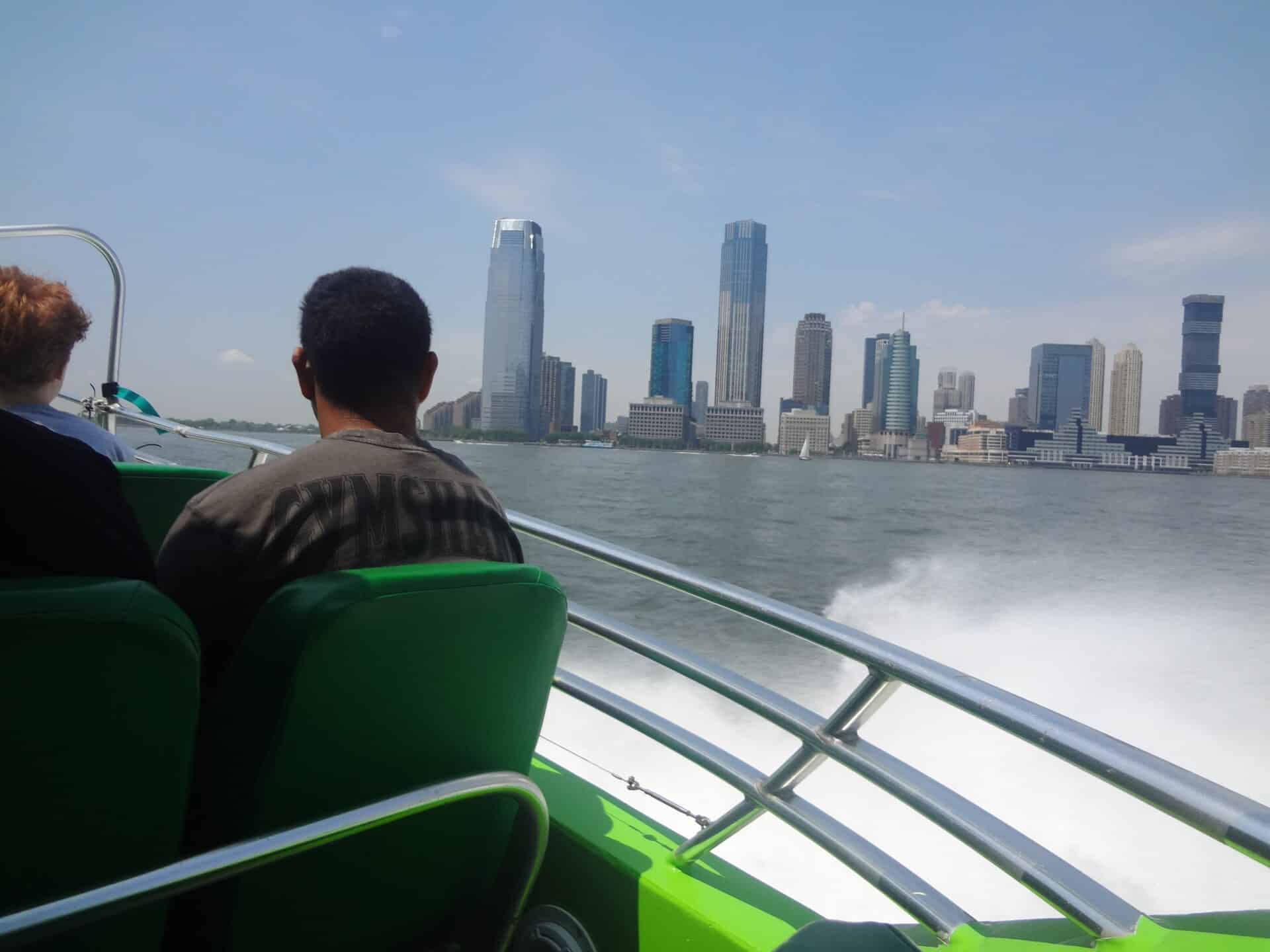 Once everyone was seated and buckled up, the ride started. The captain picked up speed just minutes after pulling out and we were practically flying along the Hudson River in the direction of the Statue of Liberty. We had to adjust to the powerful wind and the engines noise but nothing could put a damper on the fun time we were having. The friendly crew member (the only one allowed to stand during the ride) offered to take a photo for each person or group.